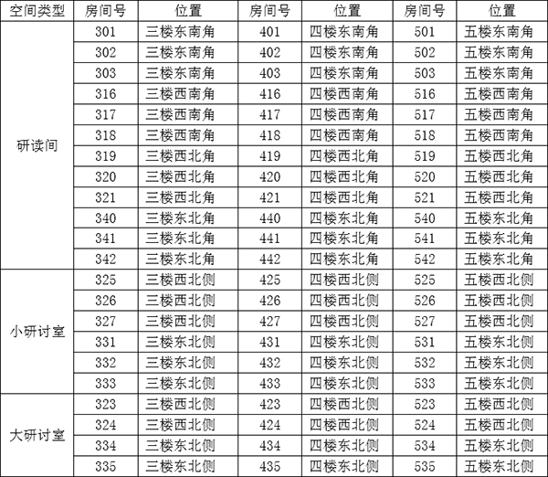 大研讨室(共12间):位于中心馆三至五层阅览区北侧。