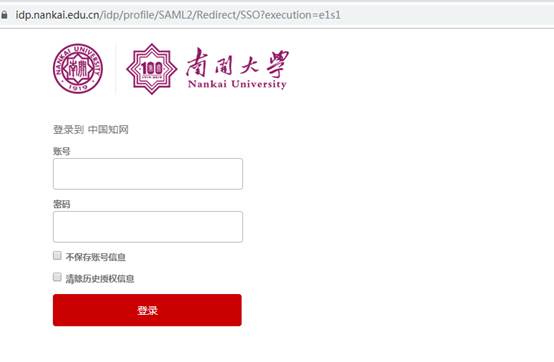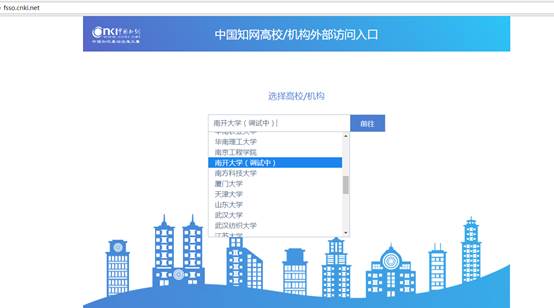 输入网址:http://fsso.cnki.net,在页面上的“选择高校/机构”下拉框中选择“南开大学”,点击“前往”。