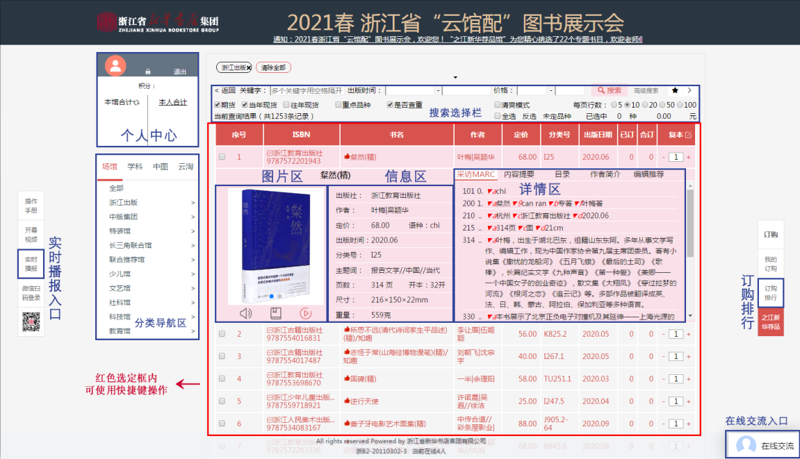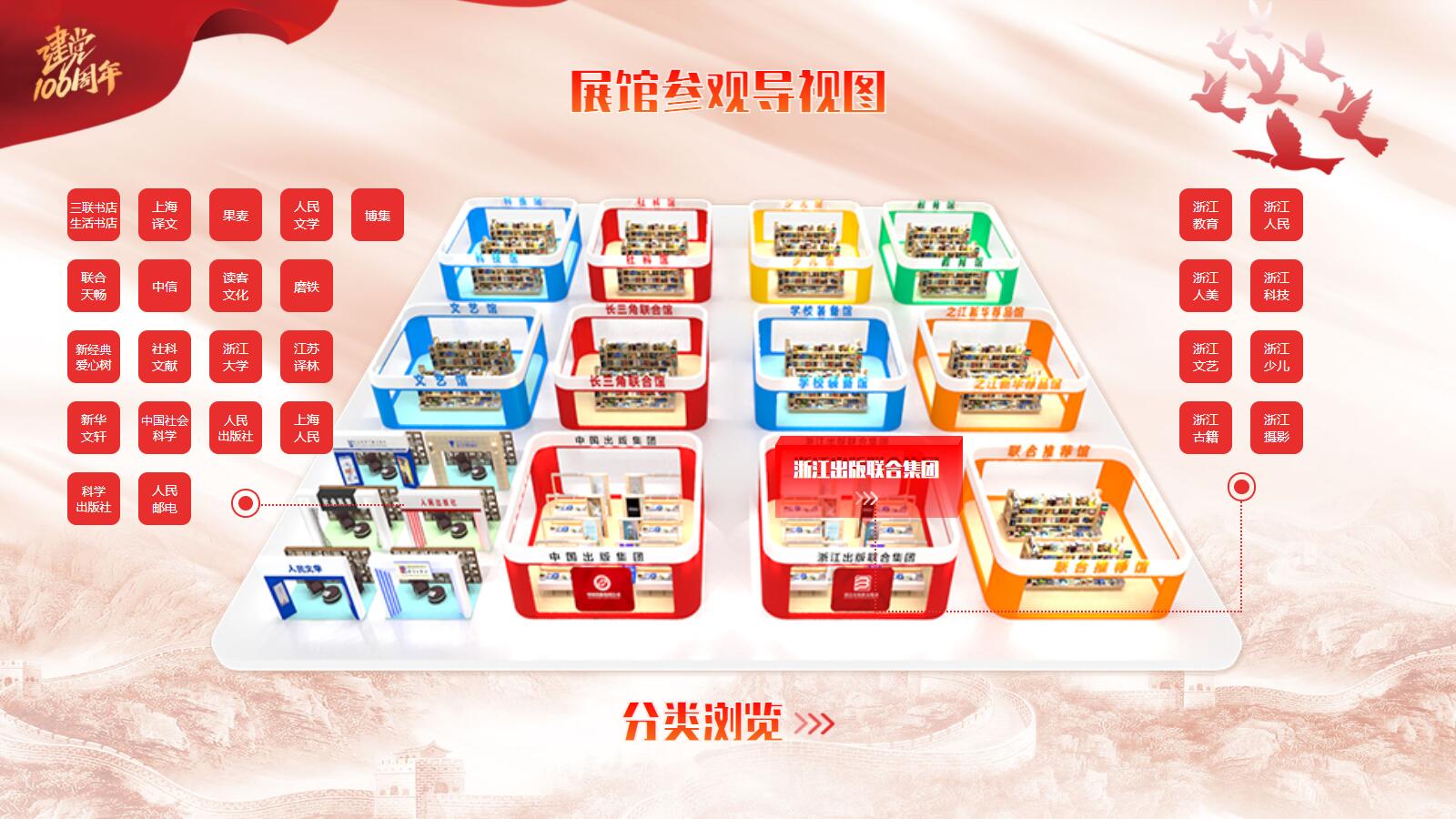 a.点击展会平台主页中央的展会入口,登录后可以看到展馆参观导视图呈现的小图标和分类浏览入口,点击进入图书订购页面。