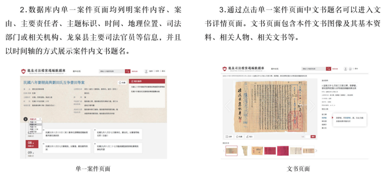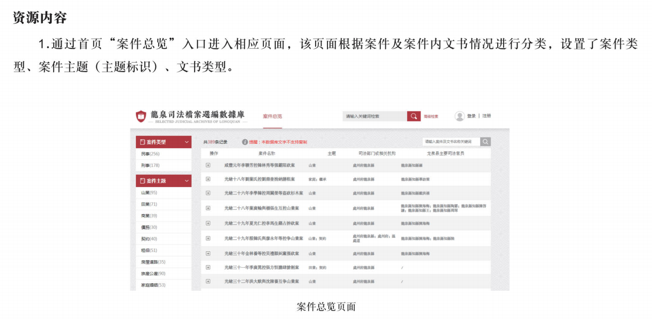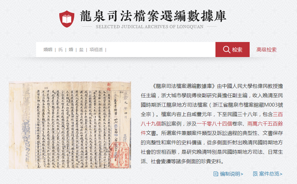 “龙泉司法档案选编数据库”是以中华书局已出版的《龙泉司法档案选编》全辑内容为基础数据,首次独家数字化的数据库成果。《龙泉司法档案选编》收入晚清至民国时期浙江龙泉地方法院司法档案(浙江省龙泉市档案馆藏M003号全宗),档案内容上自咸丰元年,下至民国三十八年,包含三百八十九个诉讼案例,涉及一千零八十四个卷宗、两万六千五百余件文书。所选案件兼顾案件类型及诉讼过程的典型性、文书保存的完整性和案件的史料价值,从多侧面折射出晚清民国时期地方社会的世相百态,是研究晚清特别是民国时期地方司法、日常生活、社会变迁等诸多侧面的珍贵史料。根据数据库建设需求,“龙泉司法档案选编数据库”提炼档案关键信息,构建成图文数据库,展现档案原貌,同时实现多重检索、分类导航、图文浏览等功能,使档案资源以多维立体的方式呈现出来。