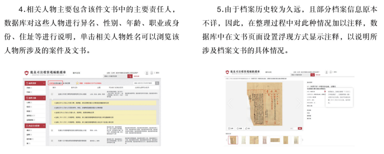 案件详情页面简介、文书详情页面的注释及相关人物介绍均以悬浮方式体现。点击相关人物介绍中高亮显示的人名即可跳转到与此人物相关的案件页面。