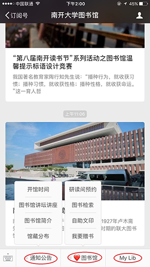 进入公众号,即可看到“通知公告”、“图书馆”和“My Lib”三个菜单栏。