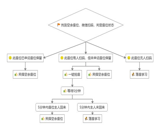 1. 入座前请先打开微信,扫描座位上的二维码,判定座位状态后才可落座学习。